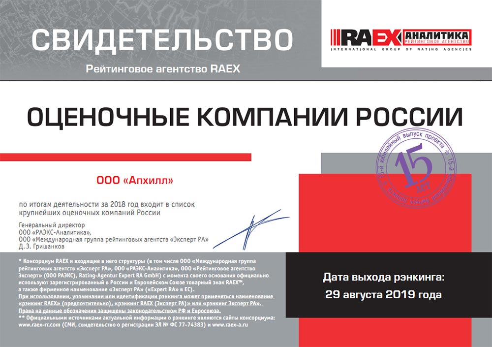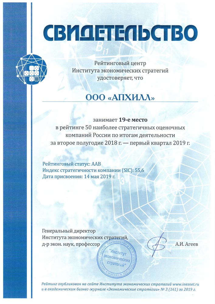 "Апхилл" входит в рейтинг крупнейших оценочных компаний по итогам 2019