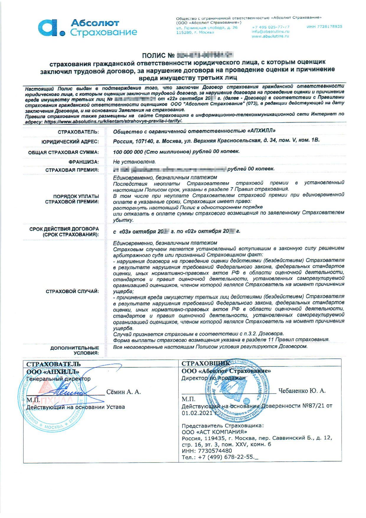 Ответственность ООО «Апхилл» застрахована. Это гарантирует возмещение расходов, которые возникли в результате нарушения права наших клиентов, включая искажение стоимости объектов оценки, а также расходы, связанные с выяснением причин, повлекших за собой такое нарушение.